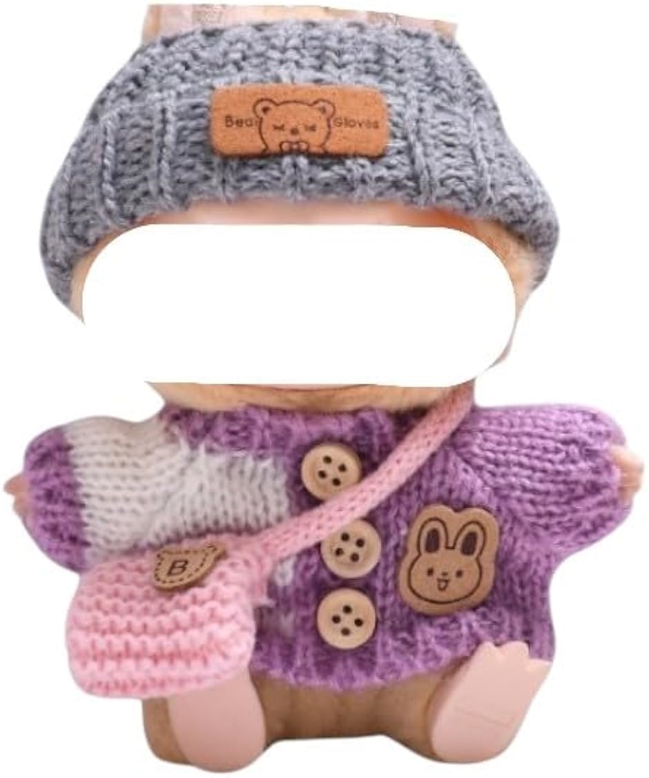 v ラブブ専用のニットコーデセットは、あったかニット帽、ボタン留めデザインのセーター、ハンドメイド感あふれるバッグが揃ったおしゃれアイテム。