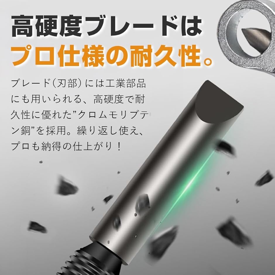 「クロムバナジウム鋼採用で高耐久」本体は、工具素材として定評のある「Cr-V(クロムバナジウム鋼)」を採用。