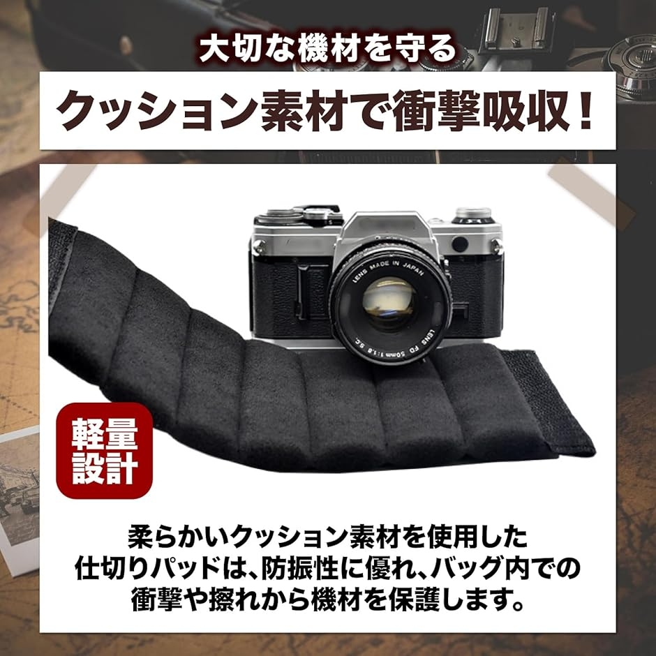 レンズやカメラボディをやさしく守りながら軽量設計で持ち運びやすさも確保。