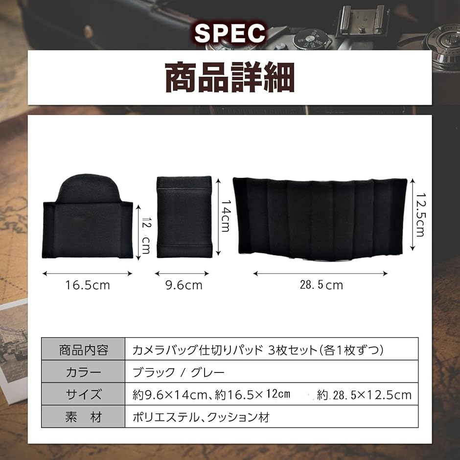 「商品内容」カメラバッグ仕切りパッド 3枚セット(各1枚ずつ)「カラー」 ブラック / グレー「サイズ」約9.6x14cm、約16.5x12cm、約28.5x12.5cm「素材」ポリエステル、クッション材 *モニターの環境により、色の見え方に若干差が生じる場合がございます。