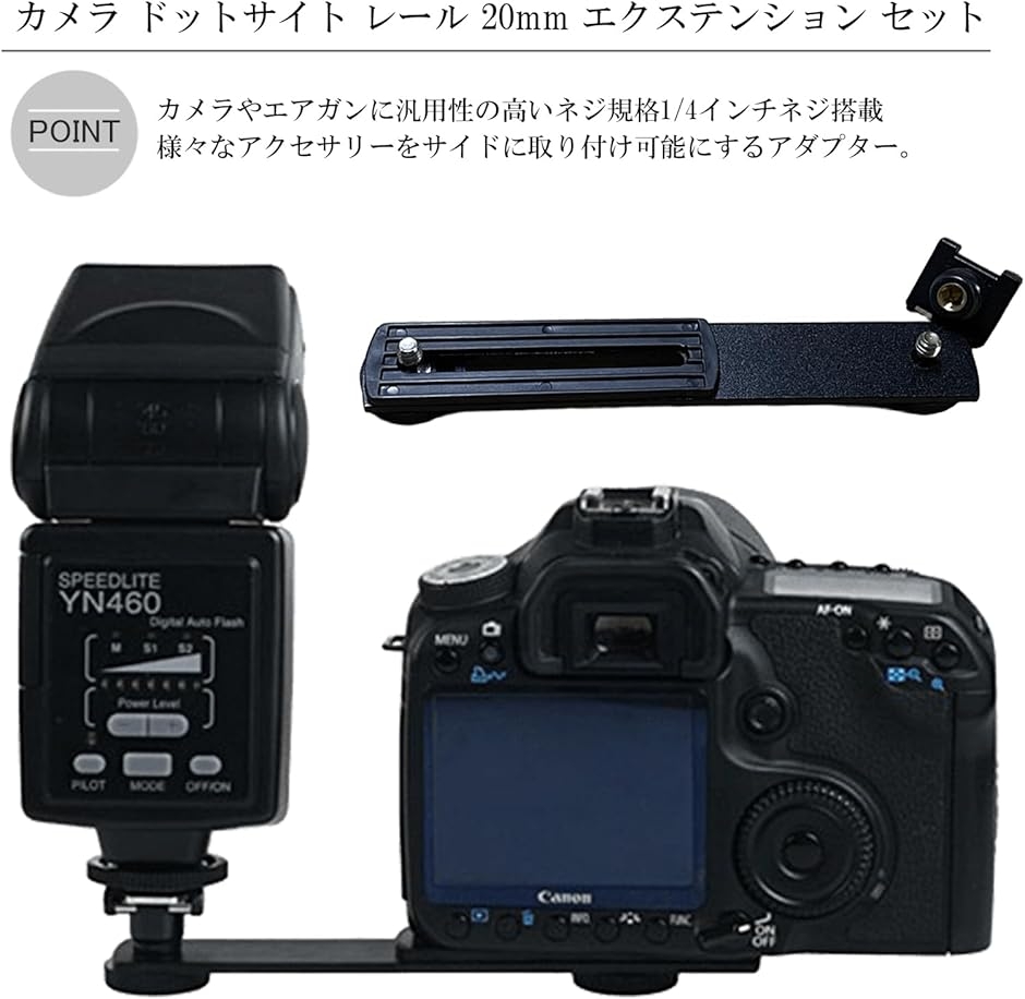 標準的な20mmレールからホットシューへの変換を担うことで、本来エアガン用ではない多くのカメラアクセサリーや照準器類が使用可能になります。