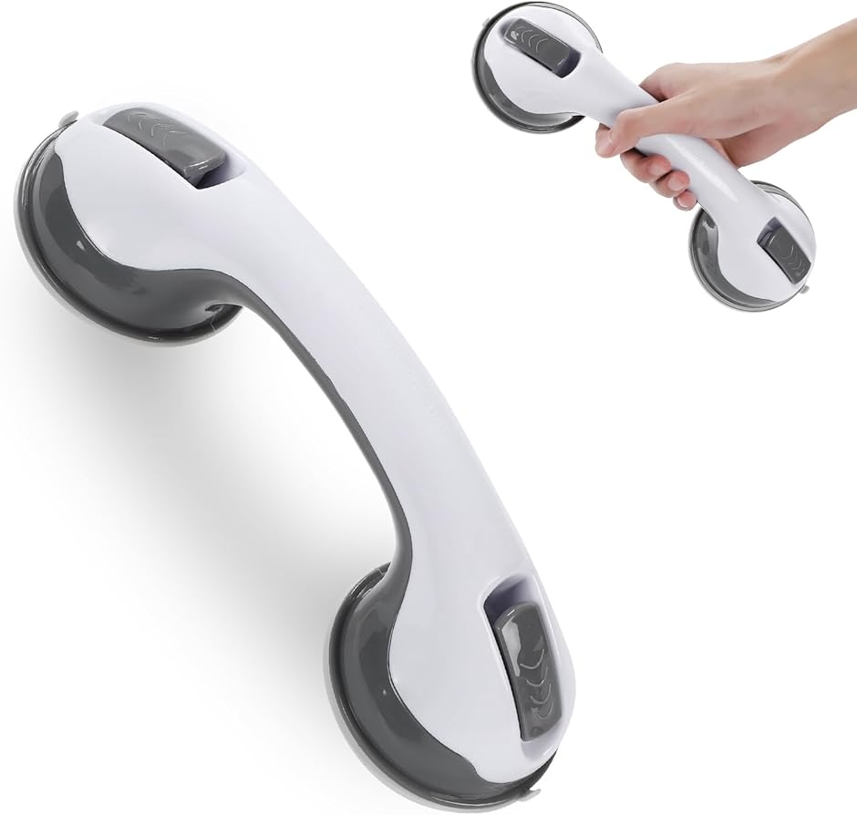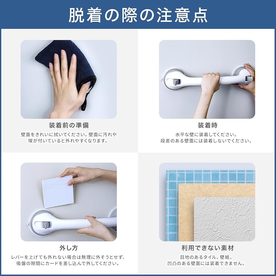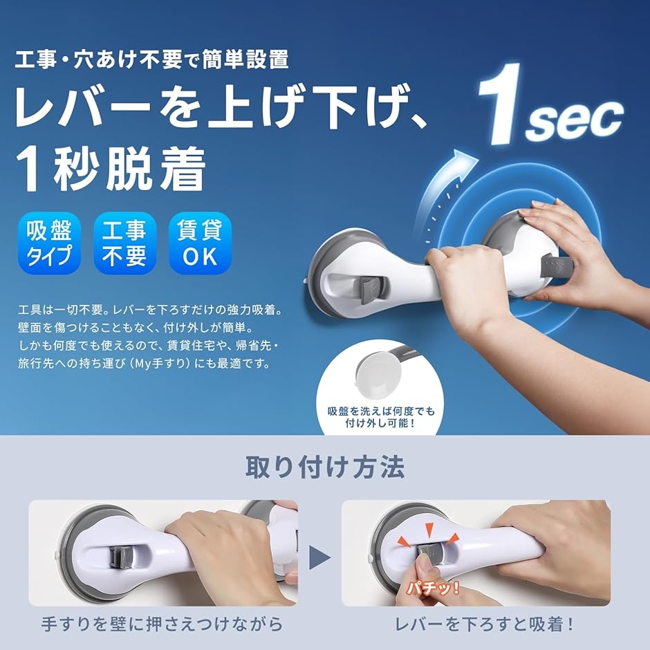 「商品詳細」 ・素材:ABS樹脂 ・カラー:ホワイトxグレー ・設置場所:玄関、階段、トイレ、バスルーム、室内各所 ・特徴:吸盤強力、穴あけ不要、取り付け簡単 ・用途:介護用手すり、ドアハンドル、入浴介助、転倒予防