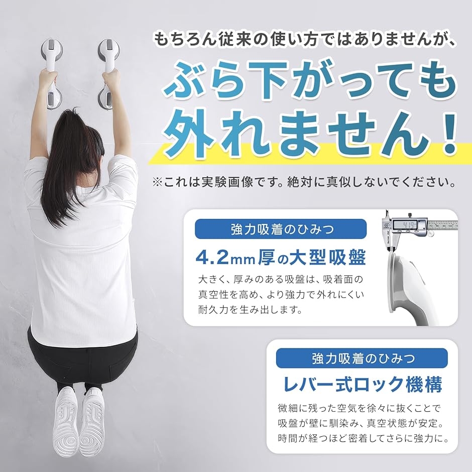 「強力吸盤でしっかり固定」 吸盤式のドアハンドルとシャワー手すりは強力に固定でき、使用中の安定感を確保します。