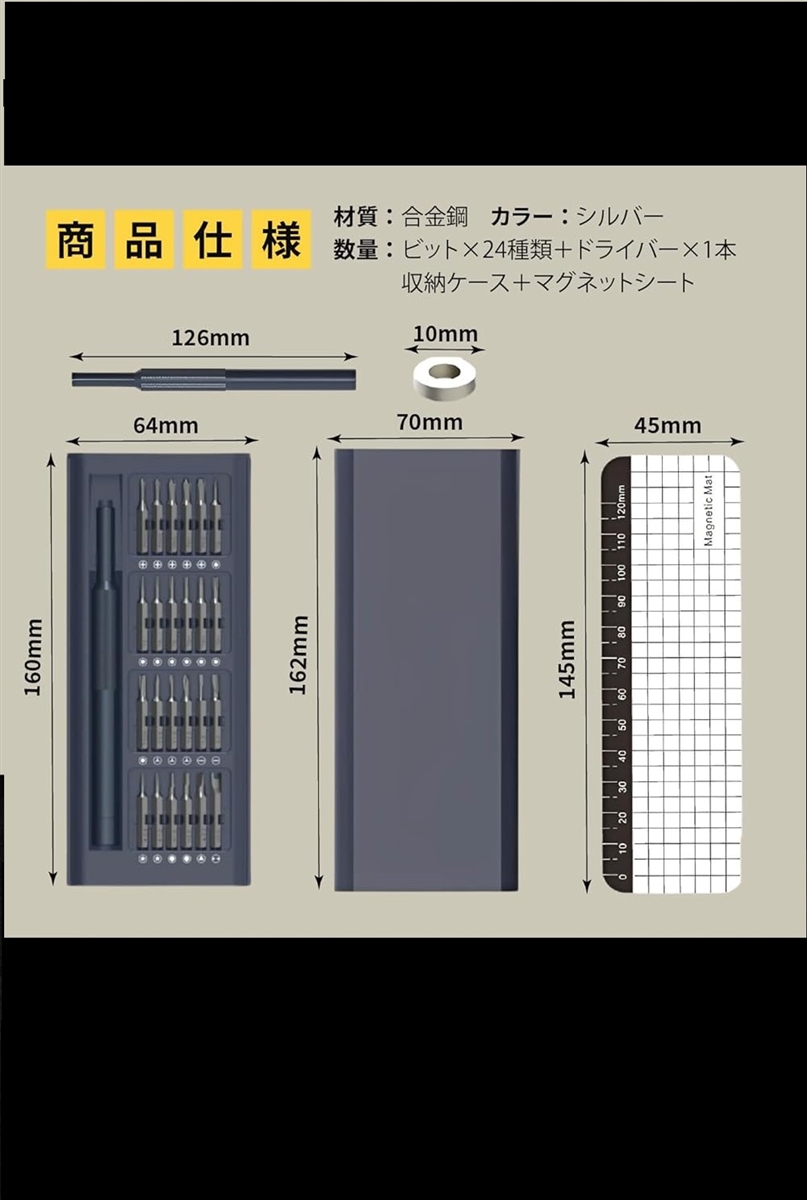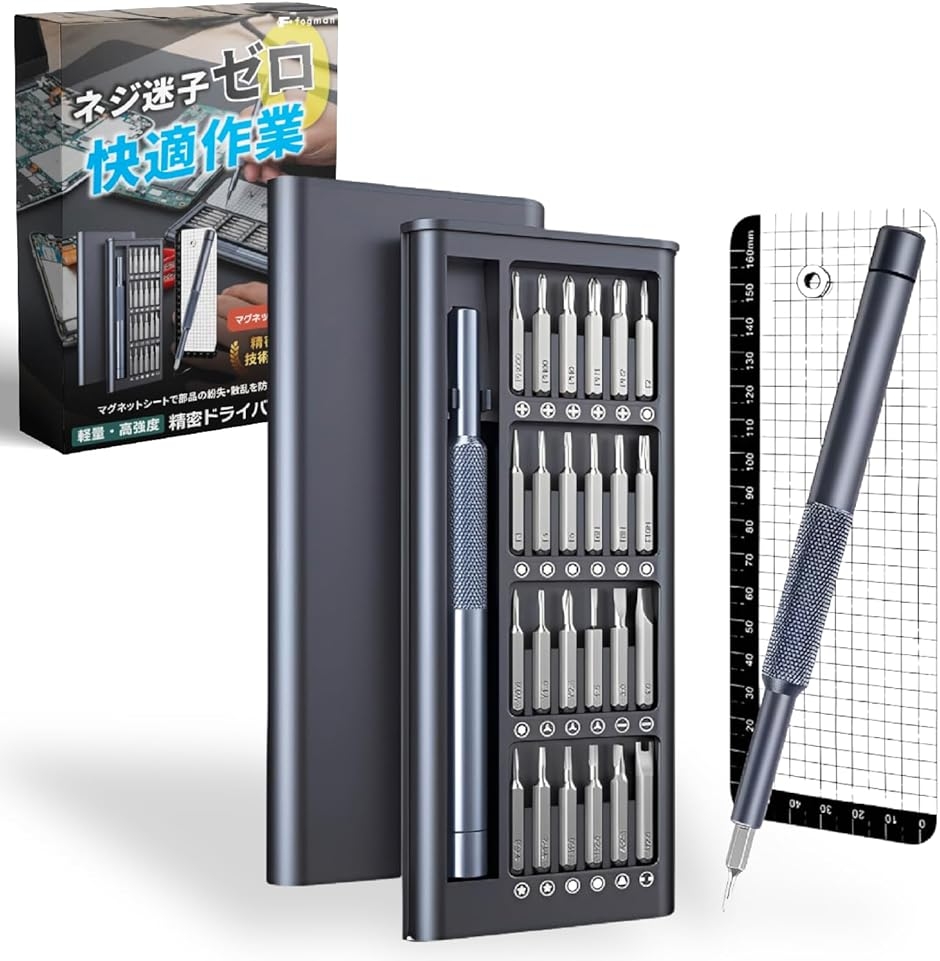 「商品仕様」 素材:高強度合金鋼ビット、アルミニウム合金ホルダー サイズ:16x6.4x1.8cm 重量:190g セット数:26 in 1(ドライバー本体+24種ビット+マグネットシート) カラー:シルバーグレー