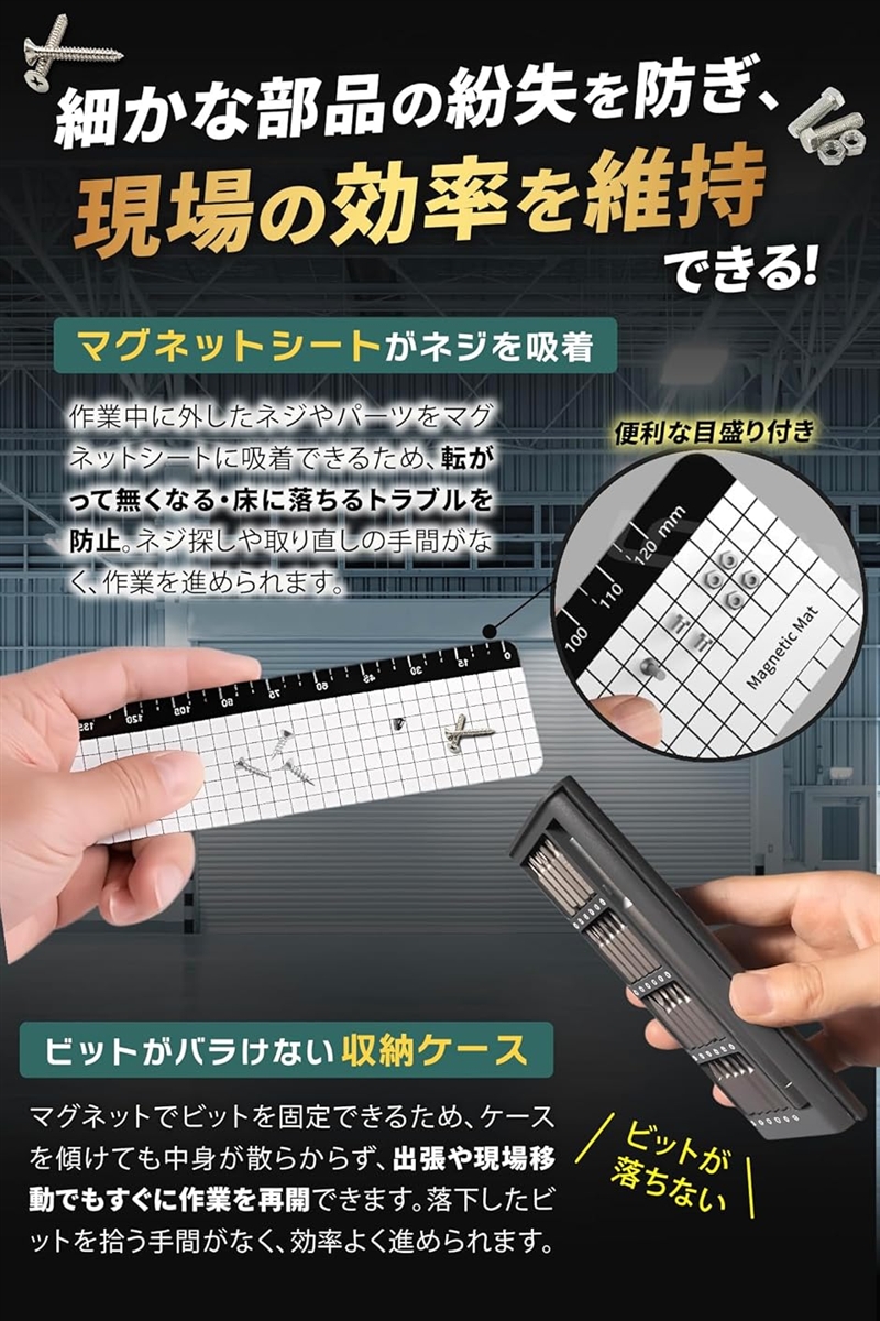 「三重磁気設計」 ドライバー先端・ビット収納・マグネットシートの3段階で磁力を活用。
