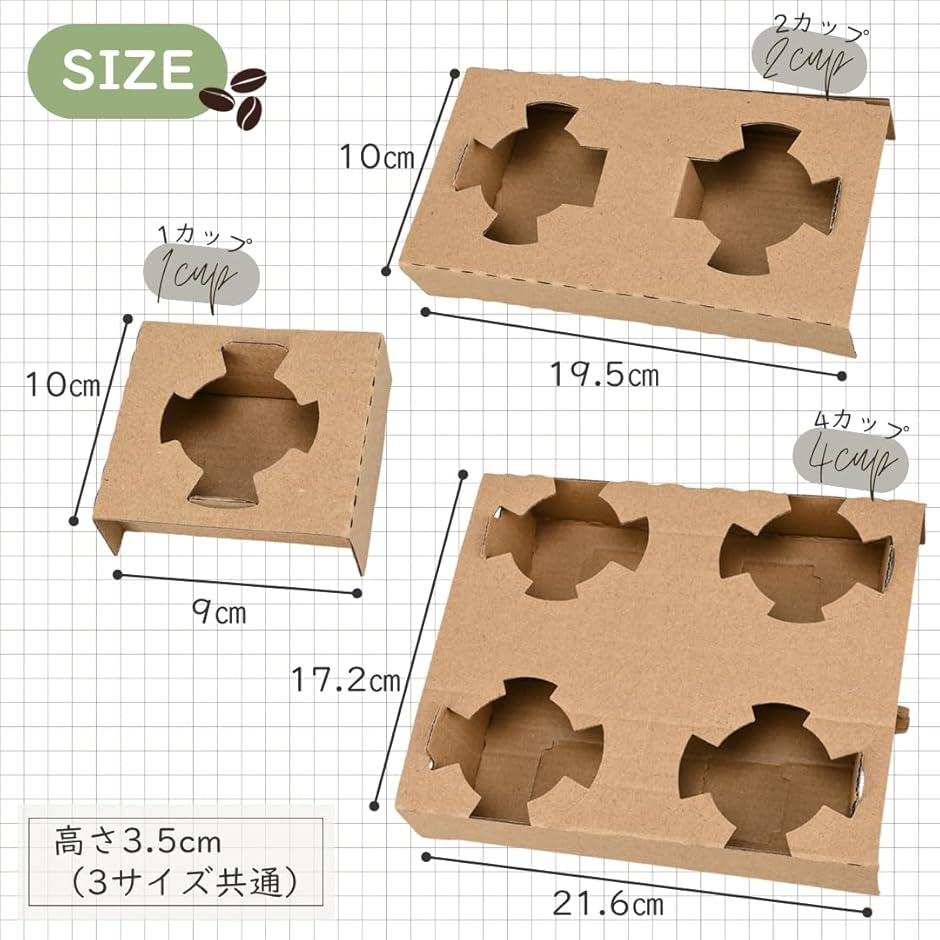 「商品詳細」セット内容:50枚 サイズ:(1カップ)10cm x 9cm (2カップ)19.5cm x 10cm (4カップ)21.6cm x 17.2cm / 高さ3.5cm(3サイズ共通) 材質:クラフト紙