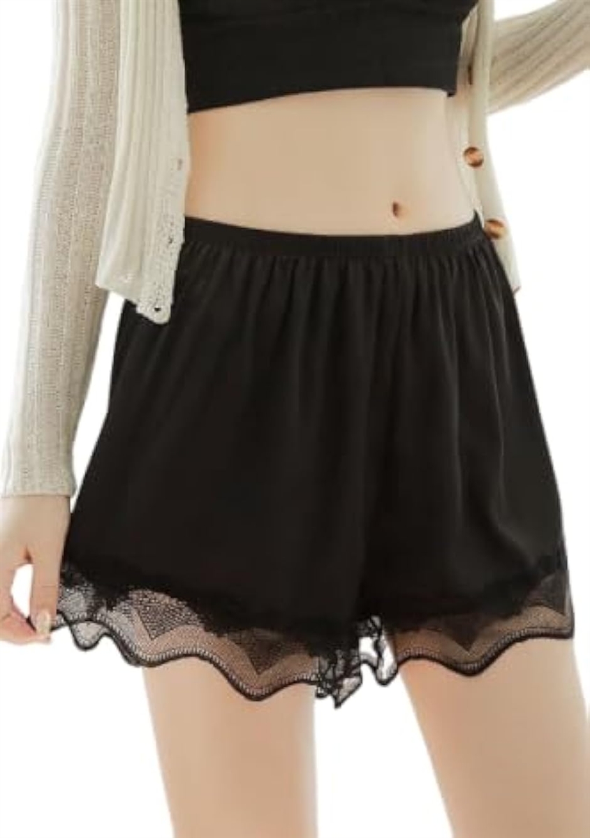 「上品なサテン風デザインのペチパンツ」光沢感のあるサテン風生地にレースをプラス。