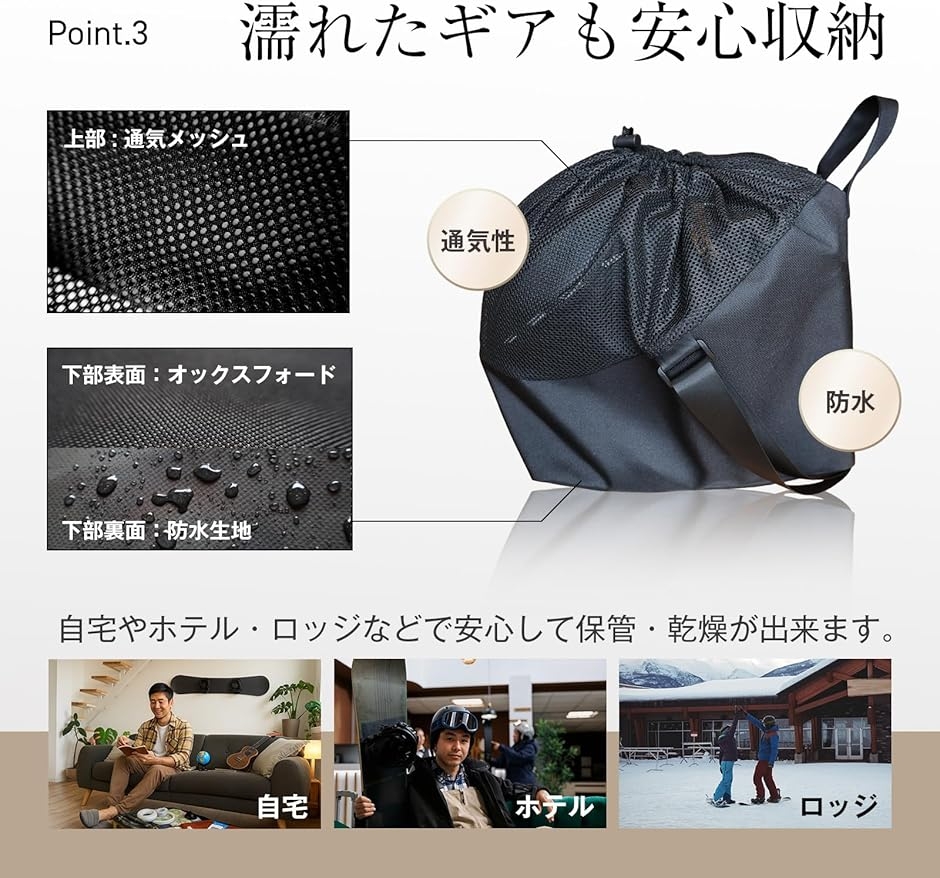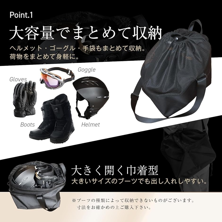「小物まで纏めて収納」大きく開く巾着タイプで、ブーツの他にもヘルメット、グローブ、ゴーグル等のギアも収納が可能です。