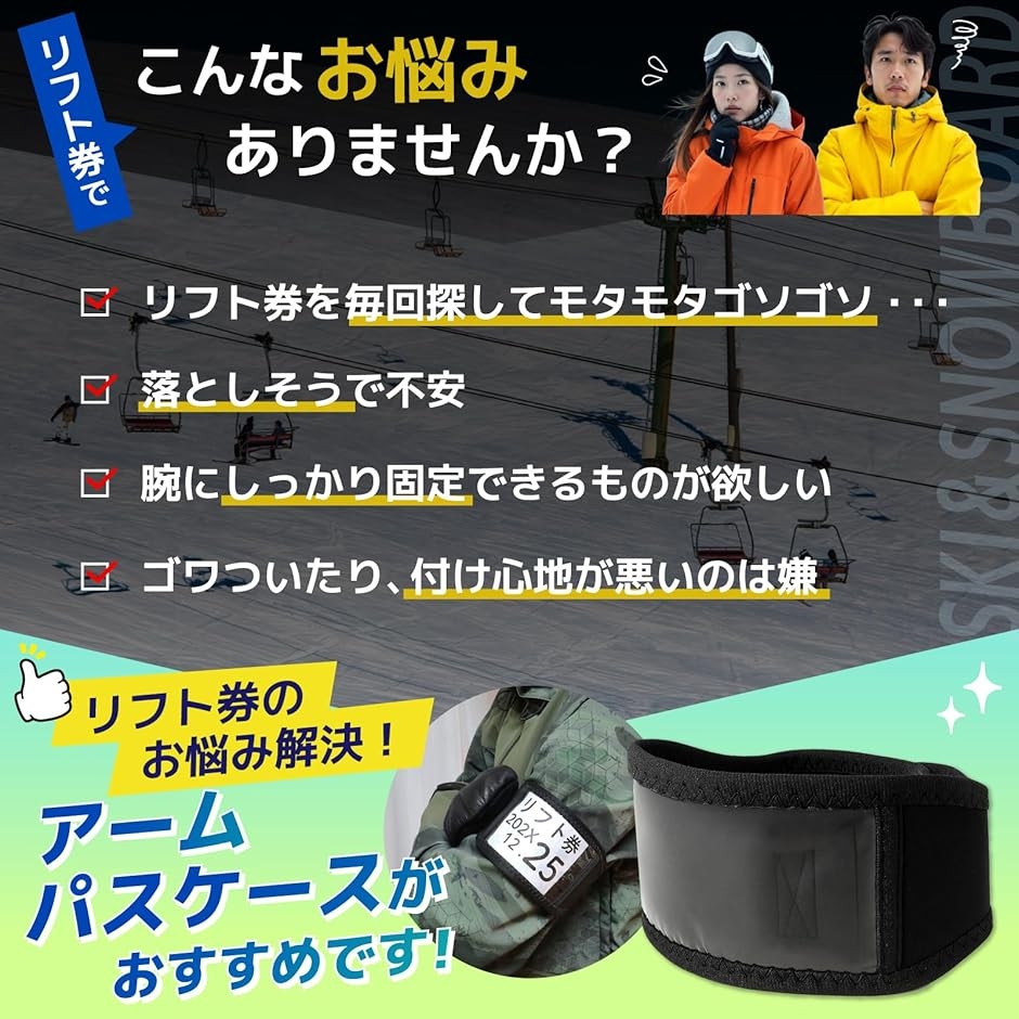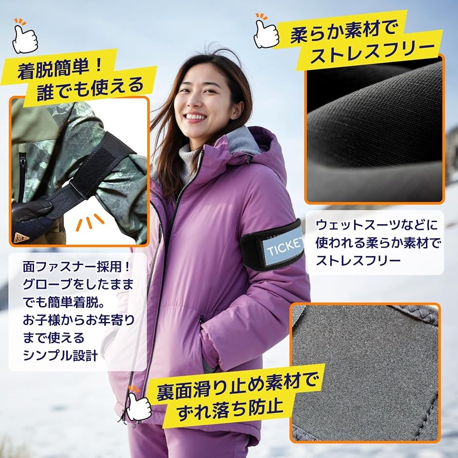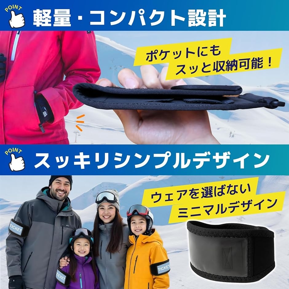 「リフト券をスマート管理」腕に装着するだけで、リフト改札もスムーズに通過。ポケットから出し入れする手間がなく、スキー・スノーボードを快適に楽しめます。