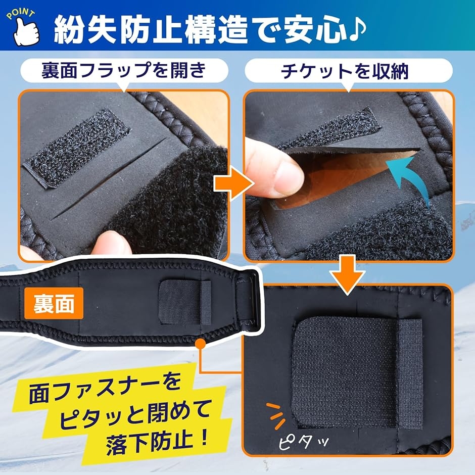 「落下防止構造で安心設計」フラップ付き収納ポケットで、リフト券がずれたり紛失したりする心配を軽減。