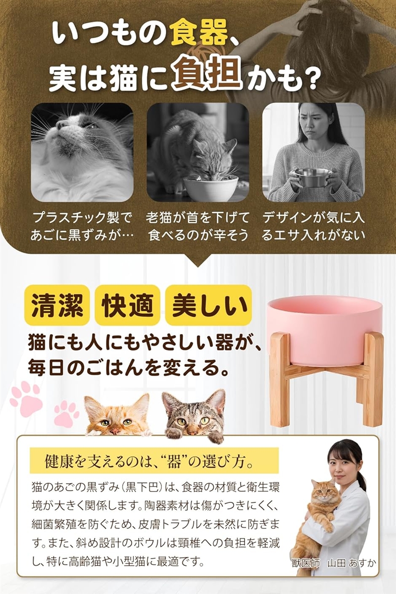 「ペットに優しい高さ設計」首や腰への負担を軽減する高さで、自然な姿勢で食事ができるように設計。