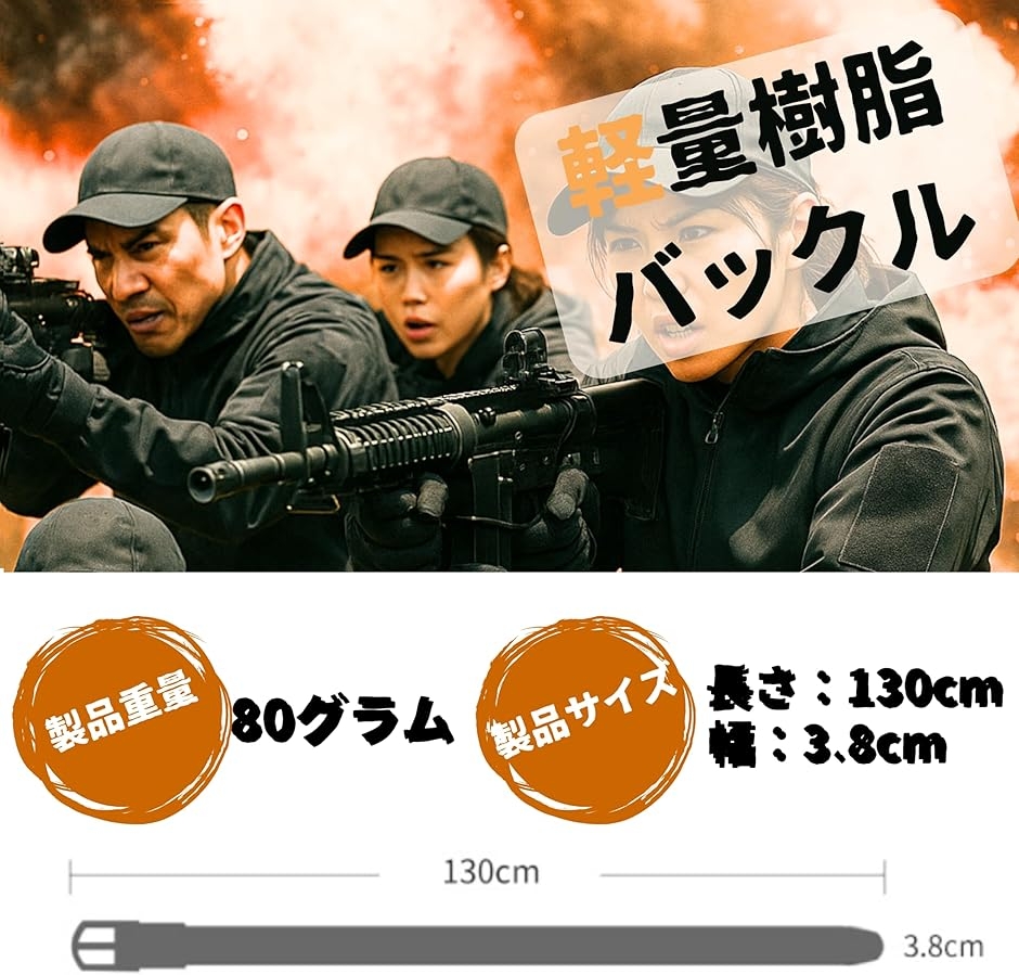 「製品仕様」 ・ベルト全長:約130cm(サイズ調整可能) ・ベルト幅:約3.8cm ・素材:高強度ナイロン/軽量樹脂バックル ・重量:約78g ・対象:メンズ/レディース/ユニセックス 過酷な現場、アウトドア、サバゲーに欠かせない、頼れるタクティカルベルト。