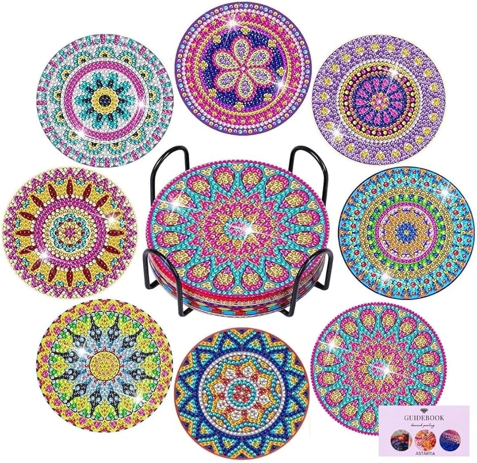 *「ダイヤモンドアートコースターセットパッケージ内容」 *曼荼羅 ダイヤモンドアートコースター:8枚 *コルクマット:8枚 *コースターホルダー:1台 *カラフルなダイヤモンド:1セット *ビーズトレイ:1個、ダイヤモンドペン:1本 *グルー:1個*チャック付ビニール小袋:5枚 *日本語取扱説明書付