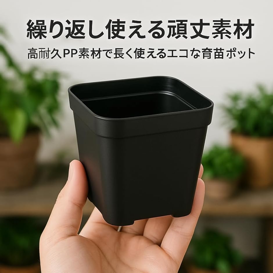 「排水設計で根腐れ防止」余分な水分をしっかり排出して植物を健康に保ちます「繰り返し使える頑丈素材」高耐久PP素材で長く使えるエコな育苗ポット「ガーデニング初心者にも最適」コンパクトサイズで扱いやすく育成も簡単「商品サイズ」約7cmx7cmx7cm、約10cmx10cmx8.5cm
