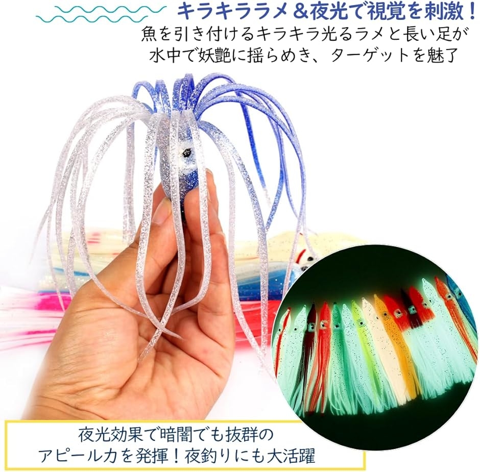 「キラキララメ&夜光で魚を魅了」魚を引き付けるきらきら光るラメと長い足、さらに夜光効果で暗闇でも抜群のアピール力を発揮。暗闇で怪しく光り、魚たちの好奇心を刺激します。