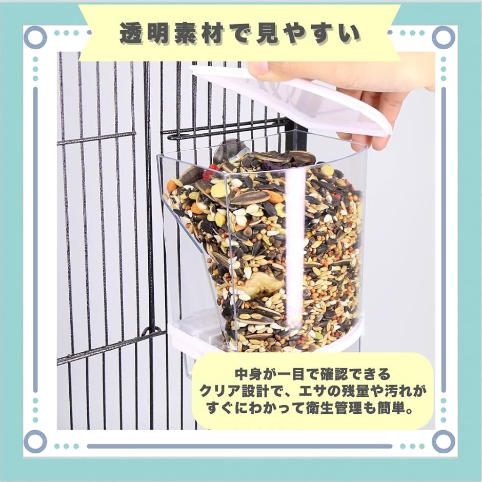 「透明素材で見やすい」中身が一目で確認できるクリア設計で、エサの残量や汚れがすぐにわかって衛生管理も簡単。