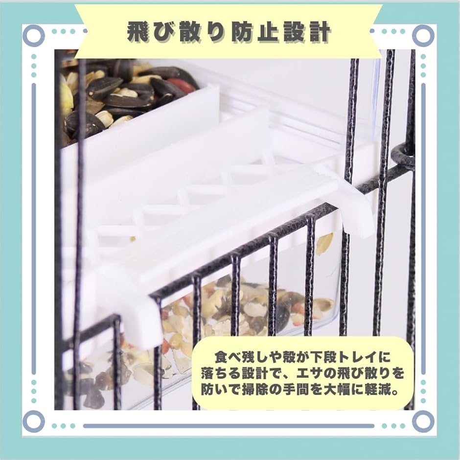 「飛び散り防止設計」食べ残しや殻が下段トレイに落ちる設計で、エサの飛び散りを防いで掃除の手間を大幅に軽減。