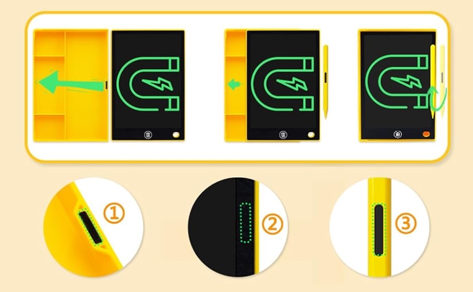 「スタイラスペン/マグネット吸着/持ち運び簡単」お絵かきボードの右側にマグネット吸着が付いています。