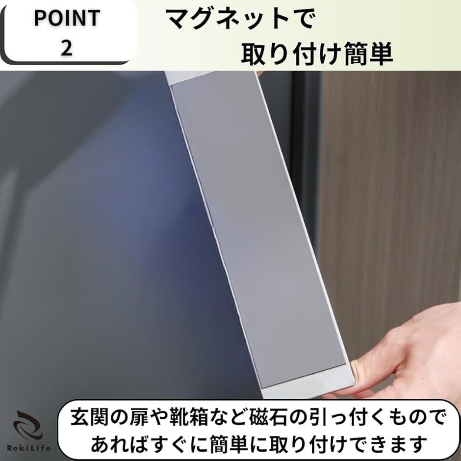 「マグネットで取り付け簡単」玄関の扉や靴箱、浴室のマグネット壁や洗濯機など磁石の引っ付くものであればすぐに簡単に取り付けできます。