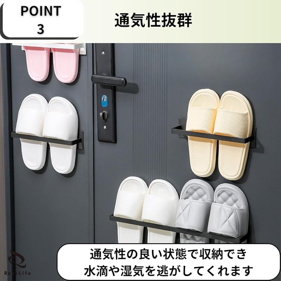 「通気性抜群」スリッパを浮かせることにより通気性の良い状態で収納でき、水滴や湿気を逃がしてくれるので清潔な状態を保つことができます。