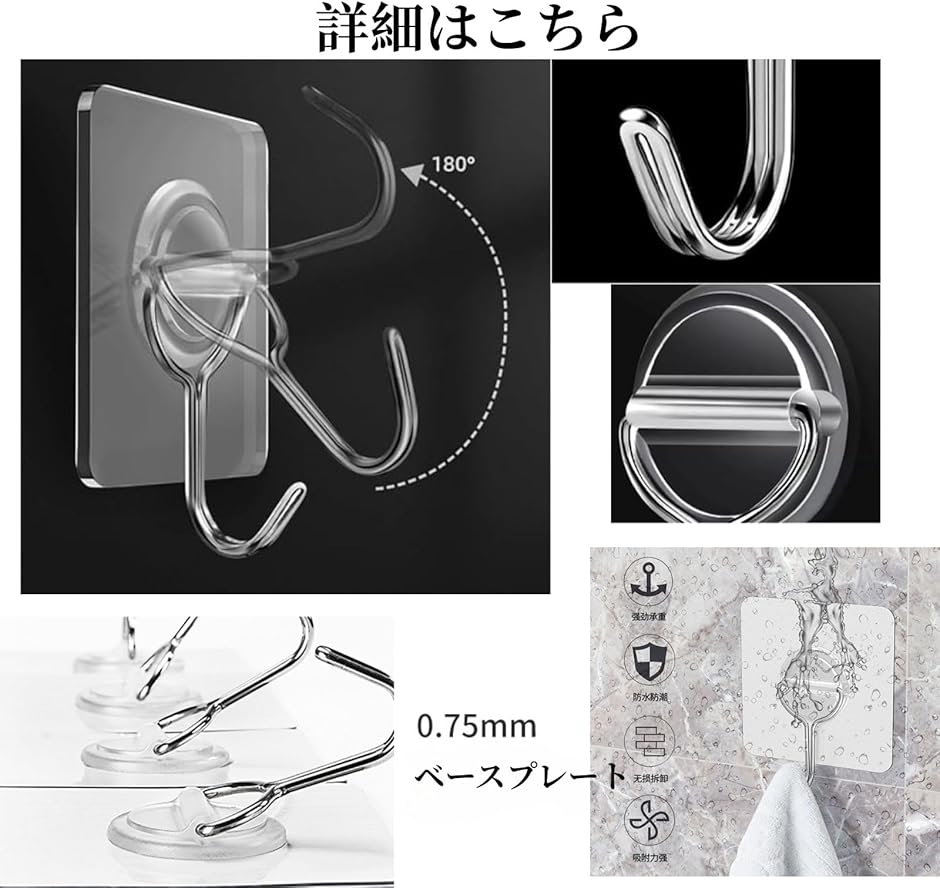 注意:使用前に製品リンクと製品包装の使用説明をよく読んで、貼り付ける前に接触面をきれいに拭いて、気泡を押し出して、重い荷物をぶら下げる時に貼り付けて24時間置いてから使用してください。