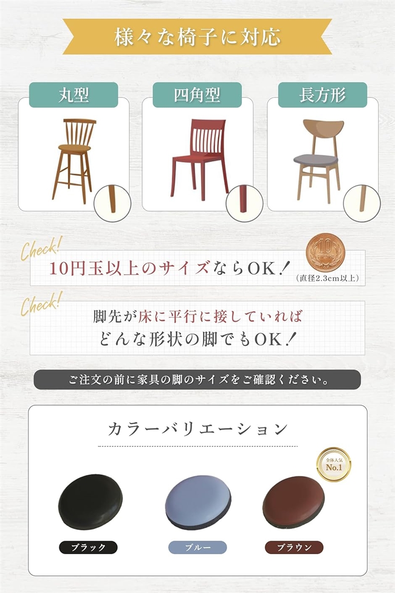 「直径2.5cmで幅広い椅子に対応」直径約2.5cmの使いやすいサイズで、ダイニングチェアやデスクチェアなど、さまざまな椅子に対応可能。さらに、強力テープでしっかり固定され、長期間ずれにくく快適に使えます。