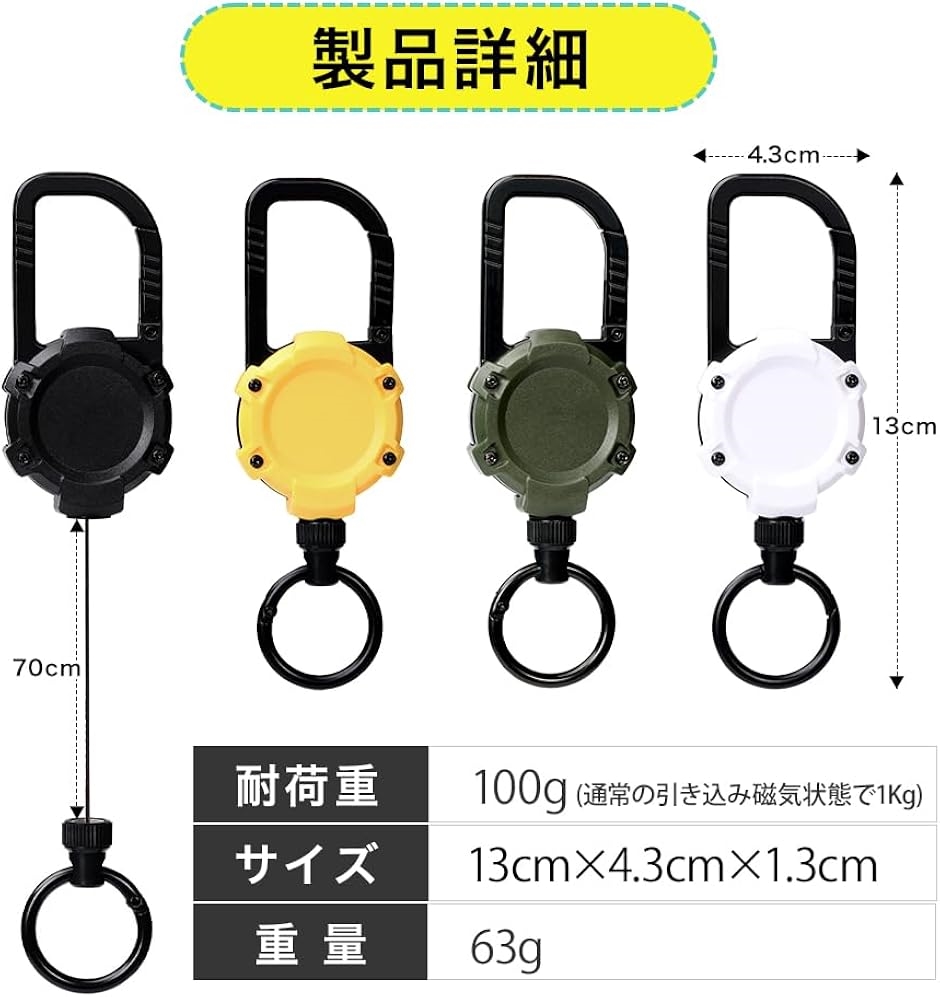 | 商品名 | 強力マグネット内蔵型 金属ワイヤー採用 1キロまで耐久 リールキーホルダー カナビラ カラビナ マグネット リング フック フィッシング 工具 釣り具 |