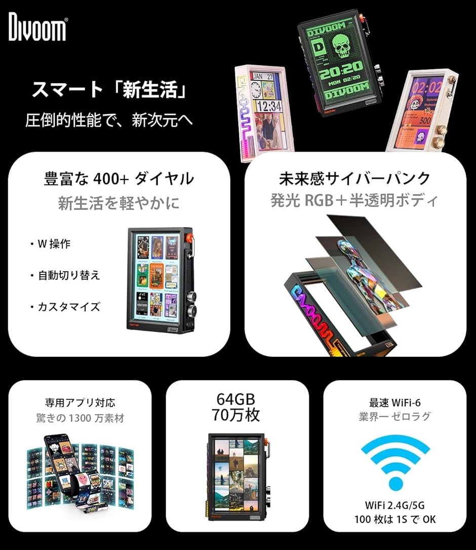 「デジタルフォトフレーム革命。多機能」「他のデジタルフォトフレームは退屈。傑作とは何か、Divoom Times Frameがついに登場。