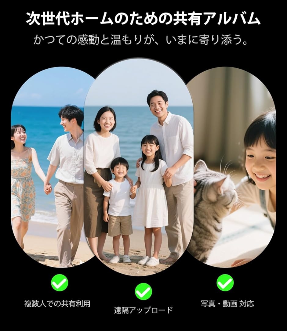 専用アプリで家族全員が同時に思い出を追加でき、誕生日プレゼント用のサプライズ起動アニメも設定可能。