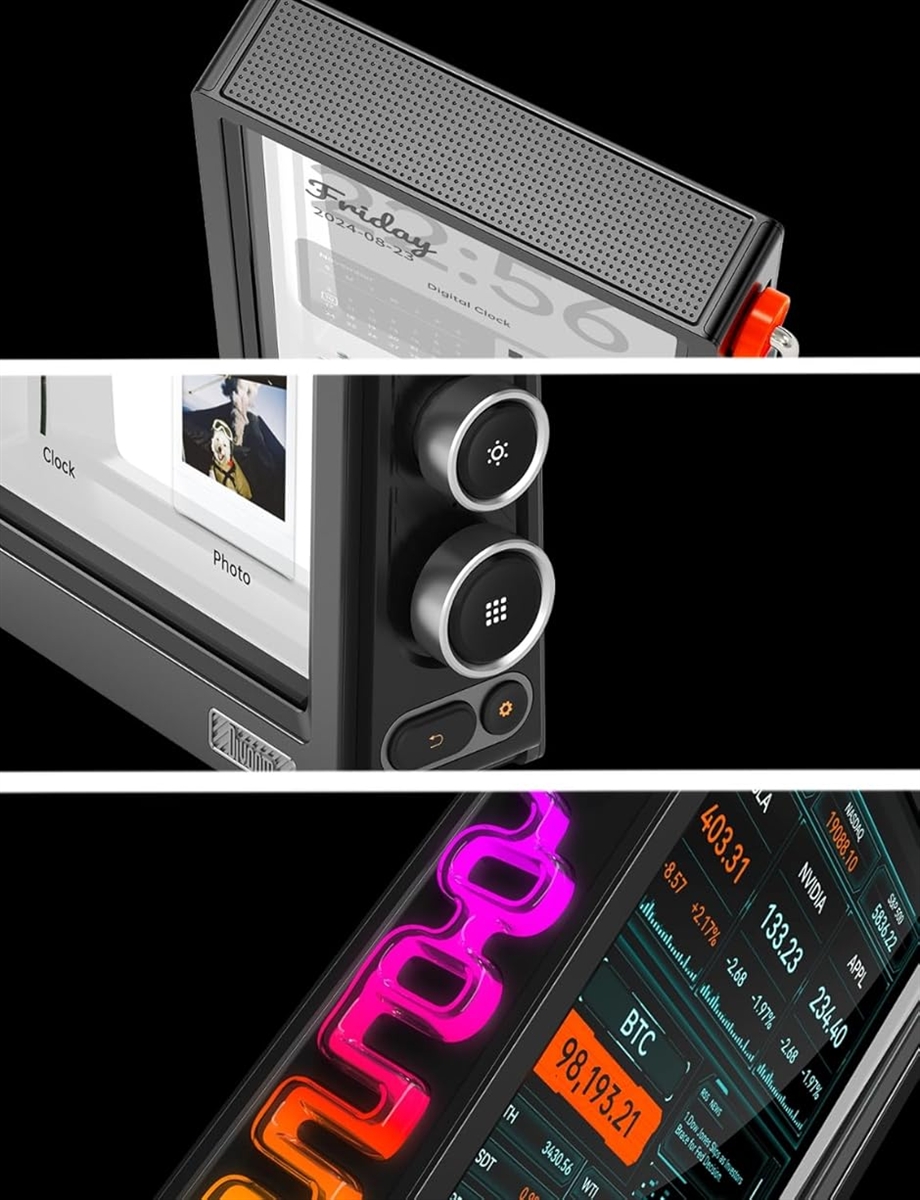 存在感のTimes Frameデジタルフォトフレームは、半透明ガラス・26個大型LEDのRGBライトバー・サイバーパンク風ホイール・スチームパイプ・特殊テクスチャーを融合。