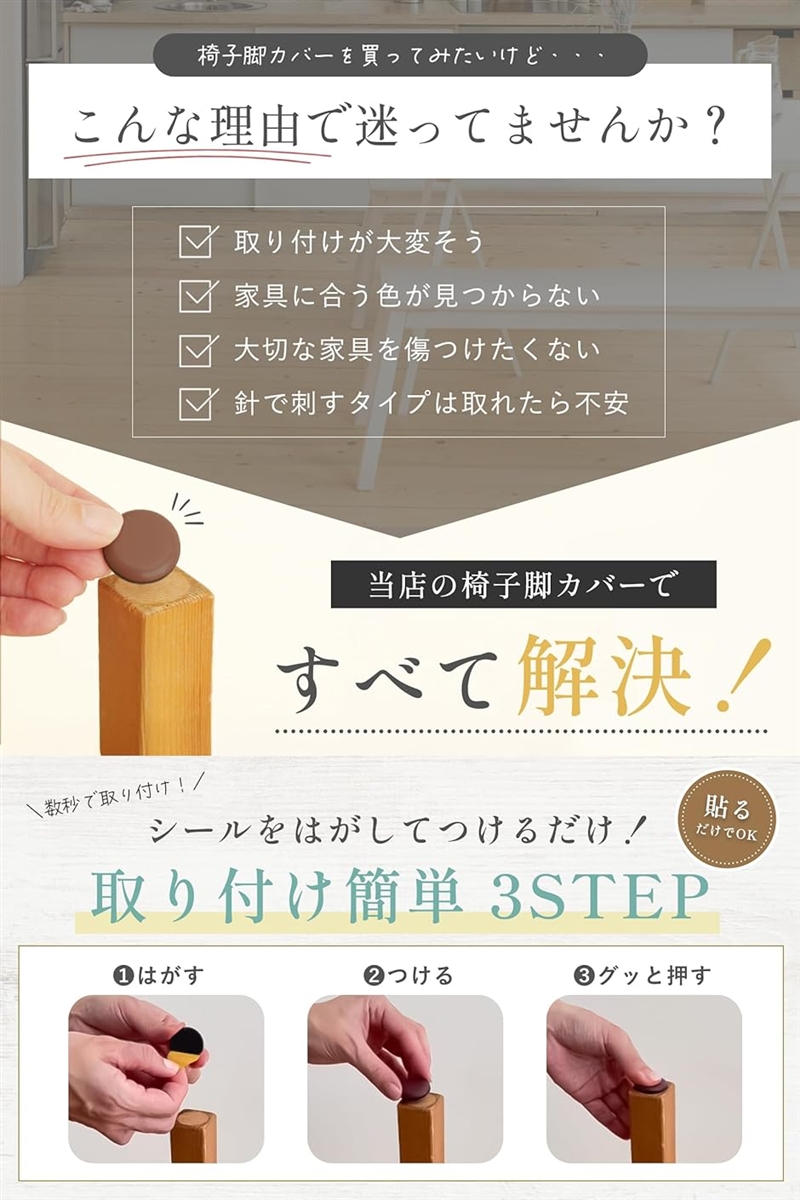 「シールをはがしてペタッと貼るだけ。」取り付けはとっても簡単。シールの裏紙をはがして、椅子の脚裏に貼るだけでOK。