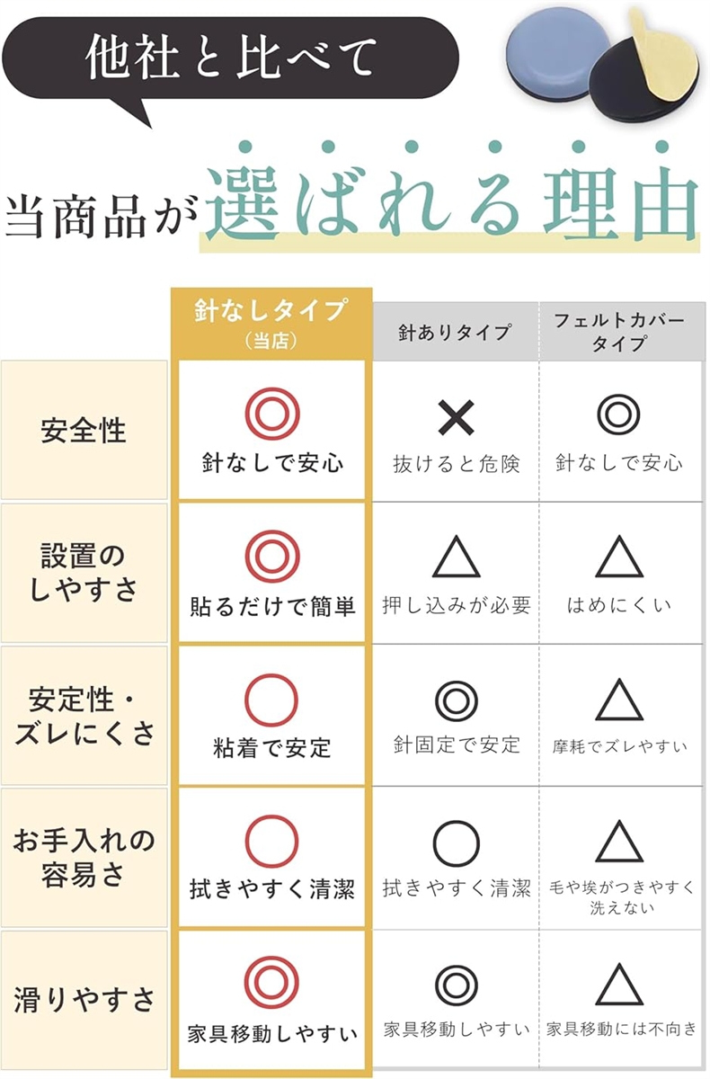 「針を使わないから、家具にも床にもやさしい」従来の画鋲タイプと違い、針を刺さずに貼るだけで使える安心設計。