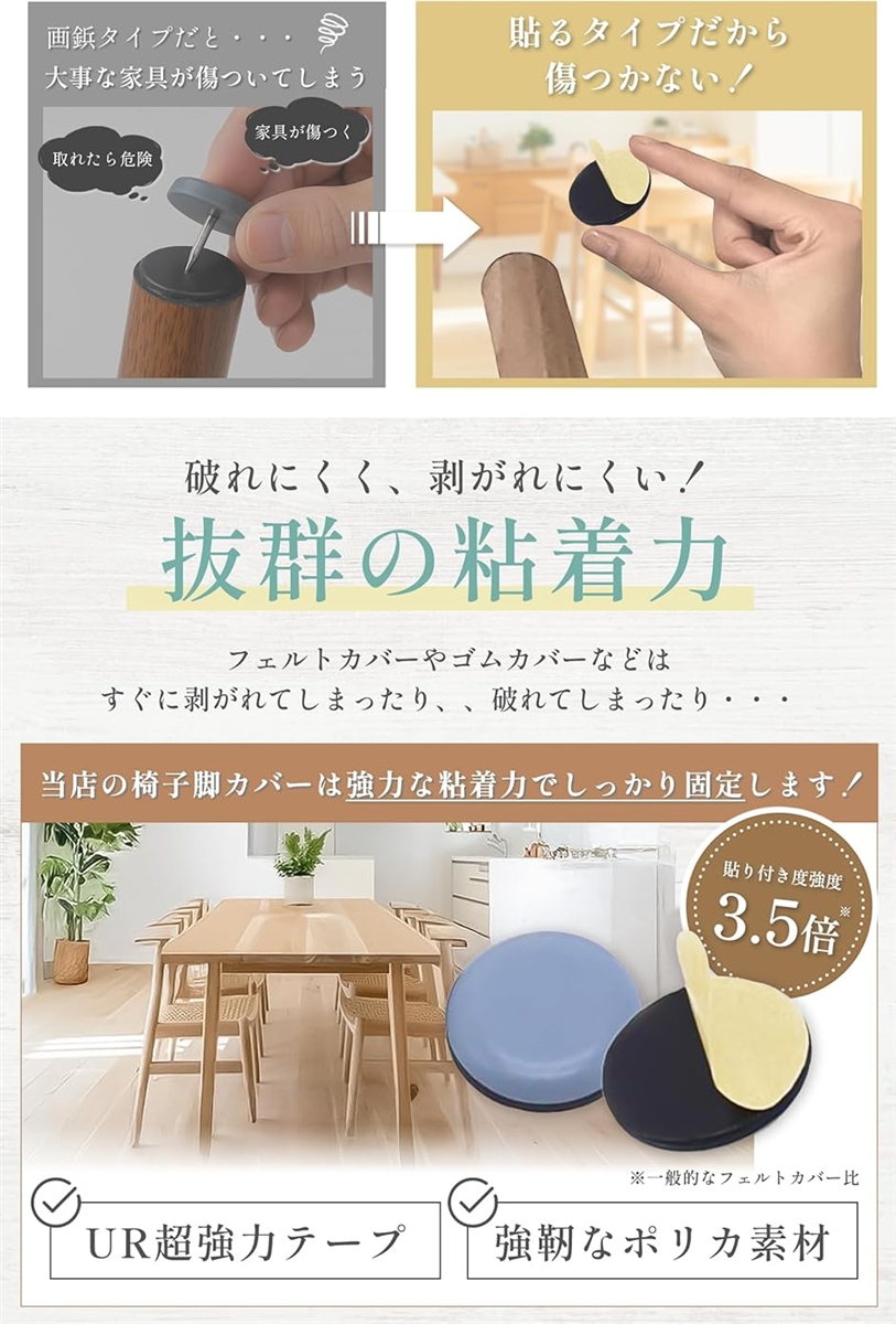 「直径2.5cmで幅広い椅子に対応」直径約2.5cmの使いやすいサイズで、ダイニングチェアやデスクチェアなど、さまざまな椅子に対応可能。さらに、強力テープでしっかり固定され、長期間ずれにくく快適に使えます。