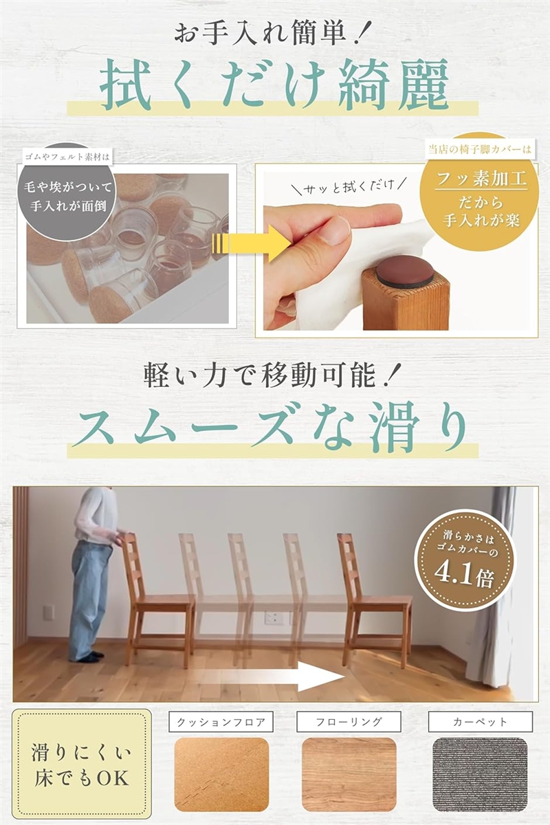 「少ない力でスーッと動く。拭くだけカンタンお手入れ」床の上を軽い力でスーッと移動。