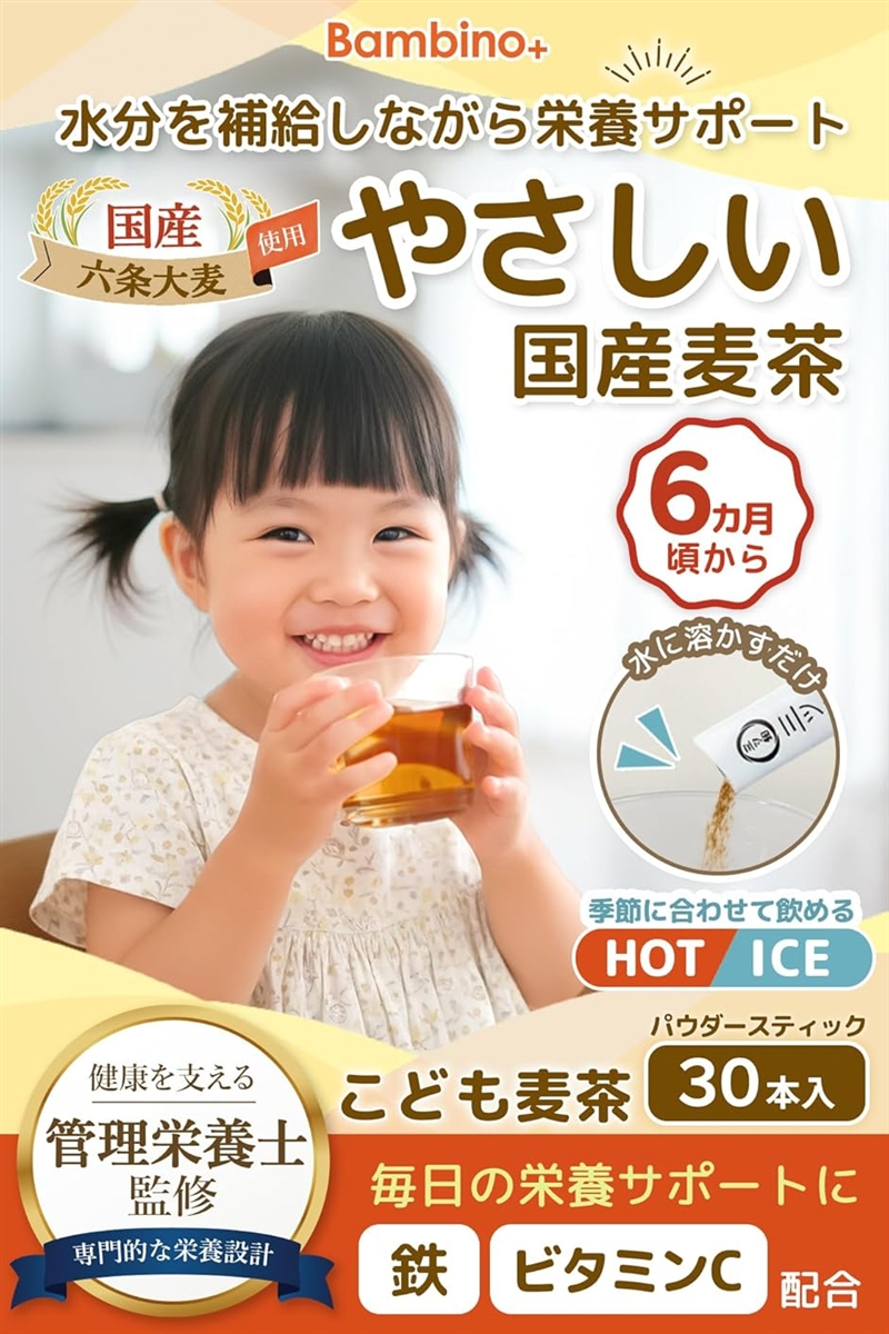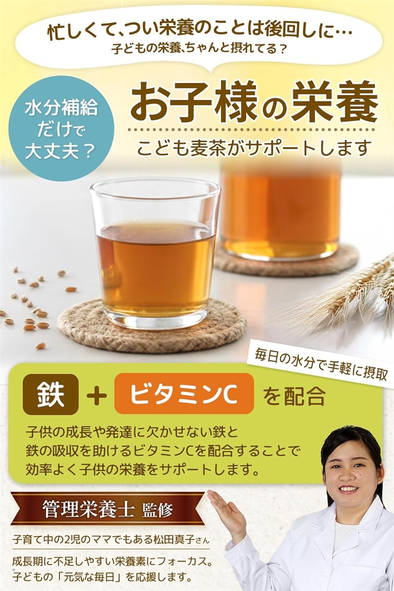 成長期に不足しがちな鉄とその吸収を助けるビタミンCを配合した管理栄養士監修のこども麦茶です。