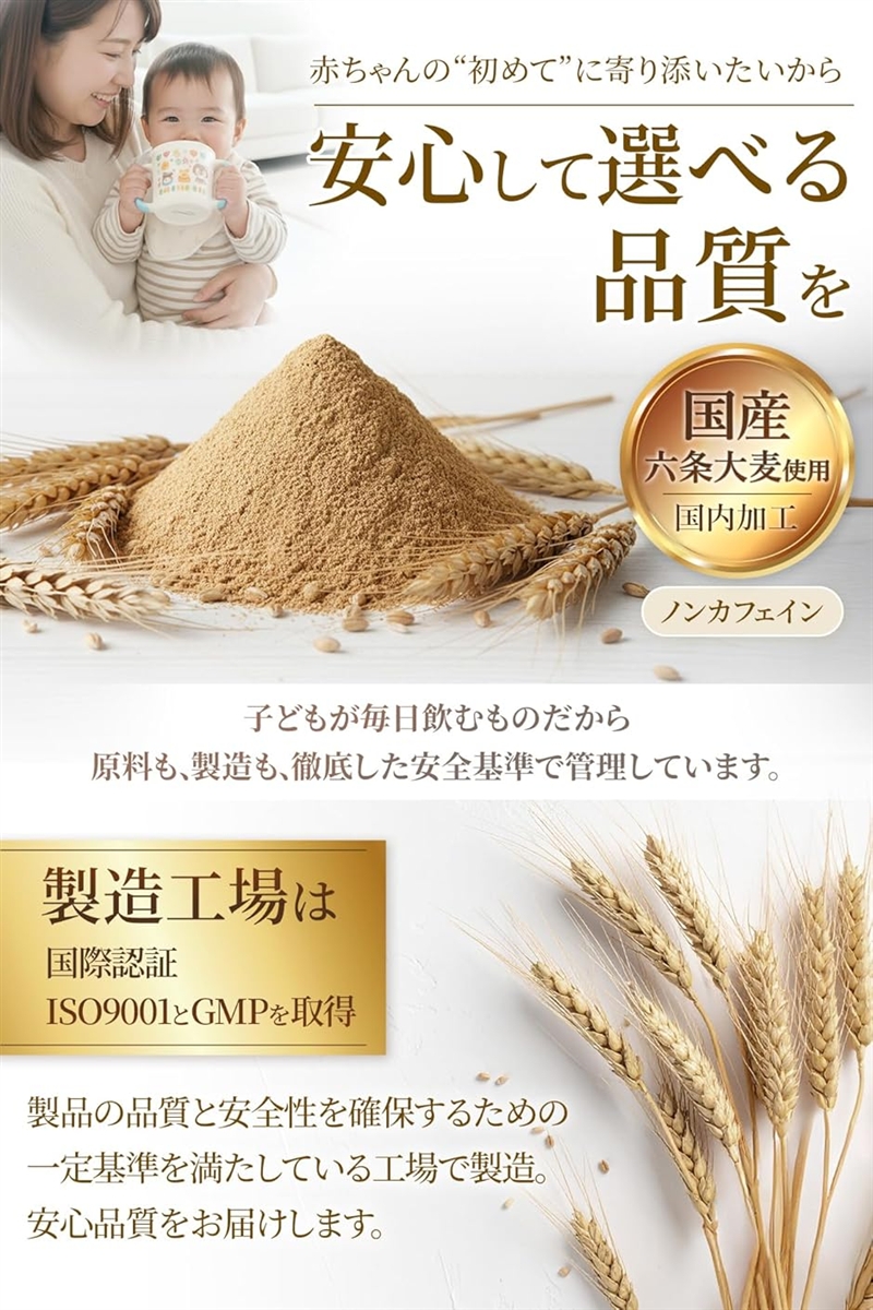 国産六条大麦を使用し、国内製造・ノンカフェインで安心して飲める品質。