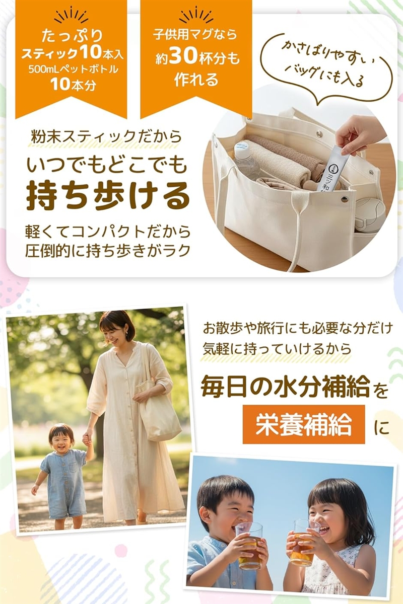 水に溶かすだけで、いつでもどこでも水分と栄養補給できる便利さが魅力です。