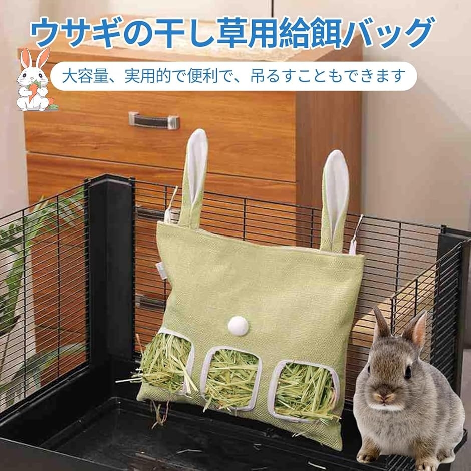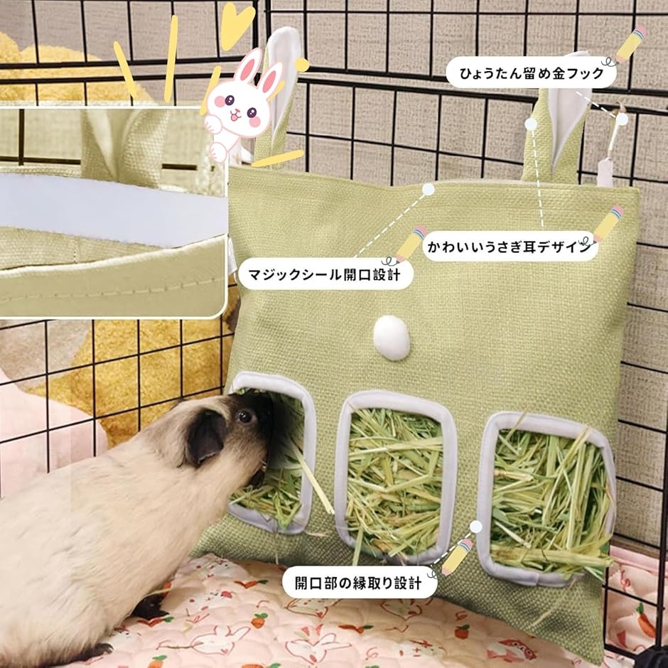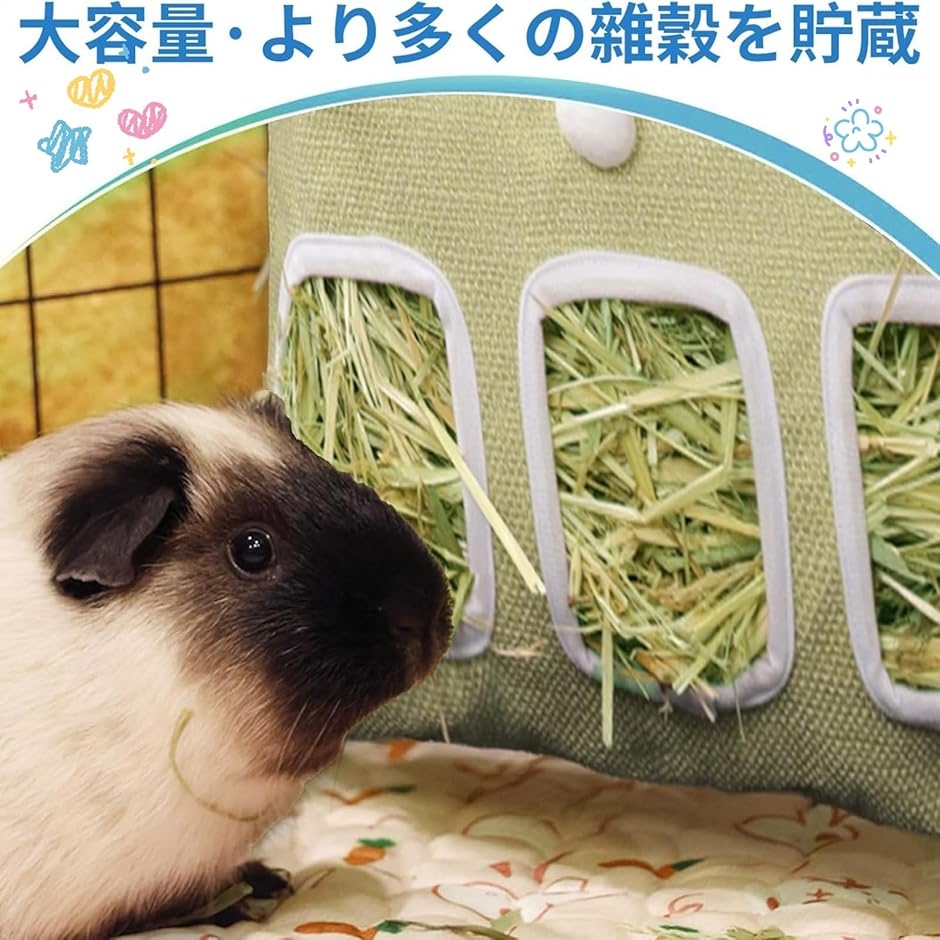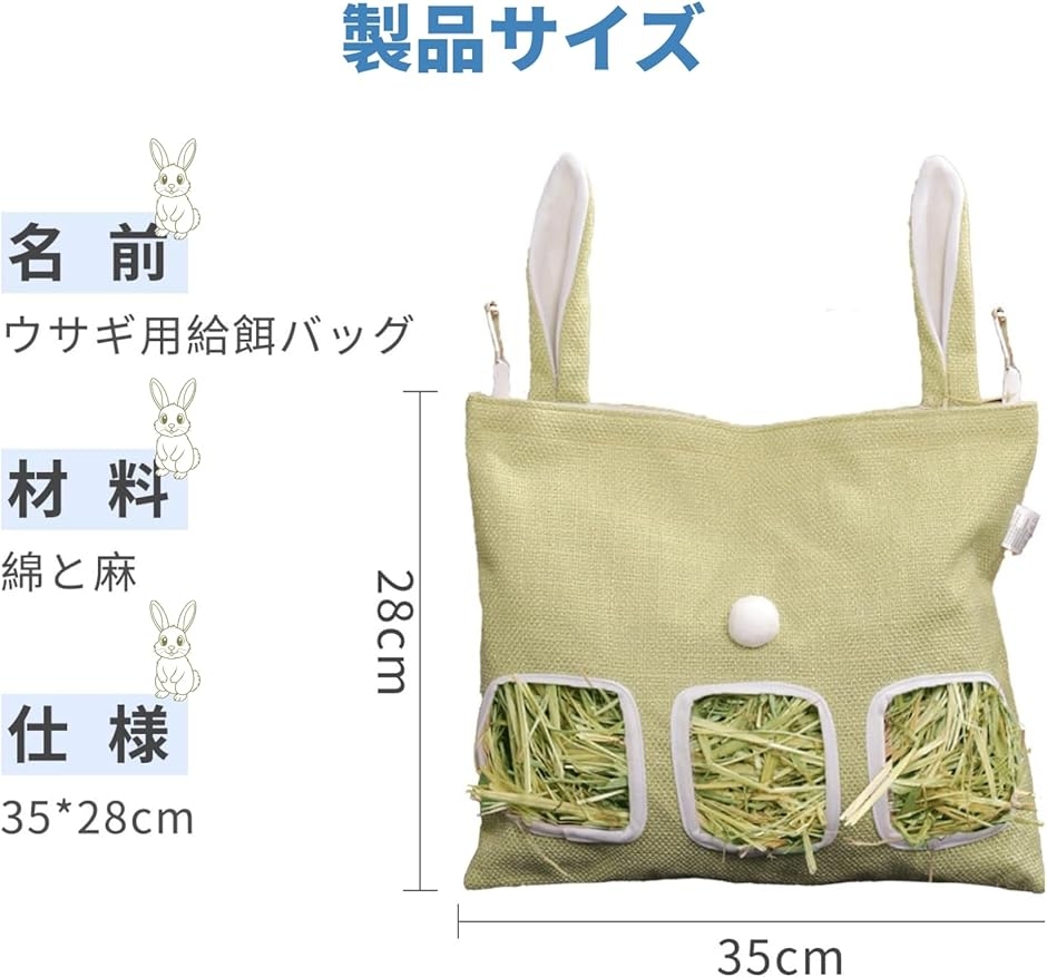 「耐久性のある素材」綿と麻を使用した丈夫な生地は、適度な摩擦力で牧草をしっかりサポートし、過剰なこぼれを防ぎます。