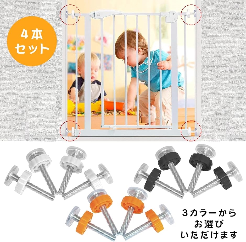 「商品内容」ベビーゲート用固定ボルト4個セット「カラー」オレンジ、ホワイト、ブラック「サイズ」M10x8cm「素材」ABS樹脂、ステンレス