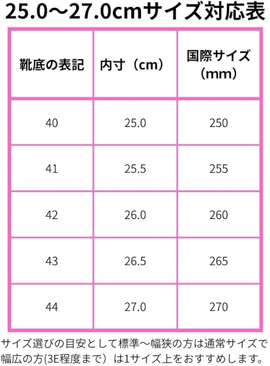 *サイズ選びの目安として標準〜幅狭の方は通常サイズで、幅広の方(3E程度まで)は1サイズ上をおすすめします。