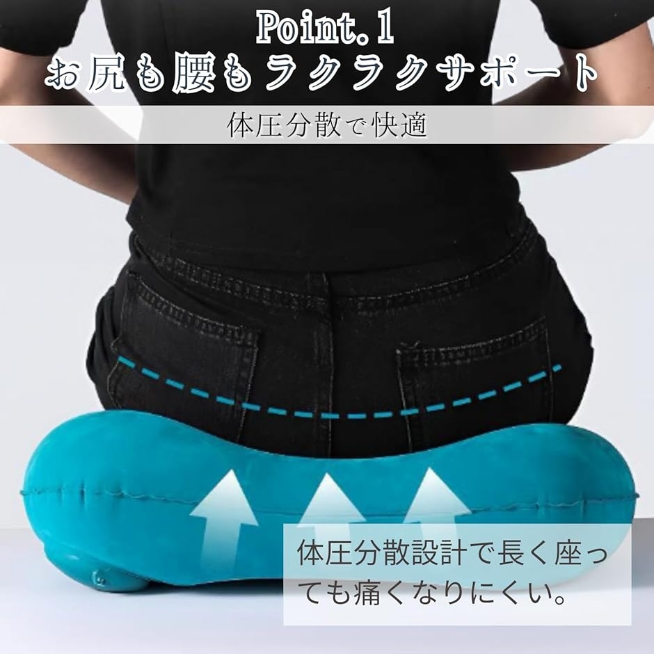 「体圧分散で快適」 適度な厚みと空気のクッションが、硬い地面や椅子からお尻を守り、体圧を分散します。