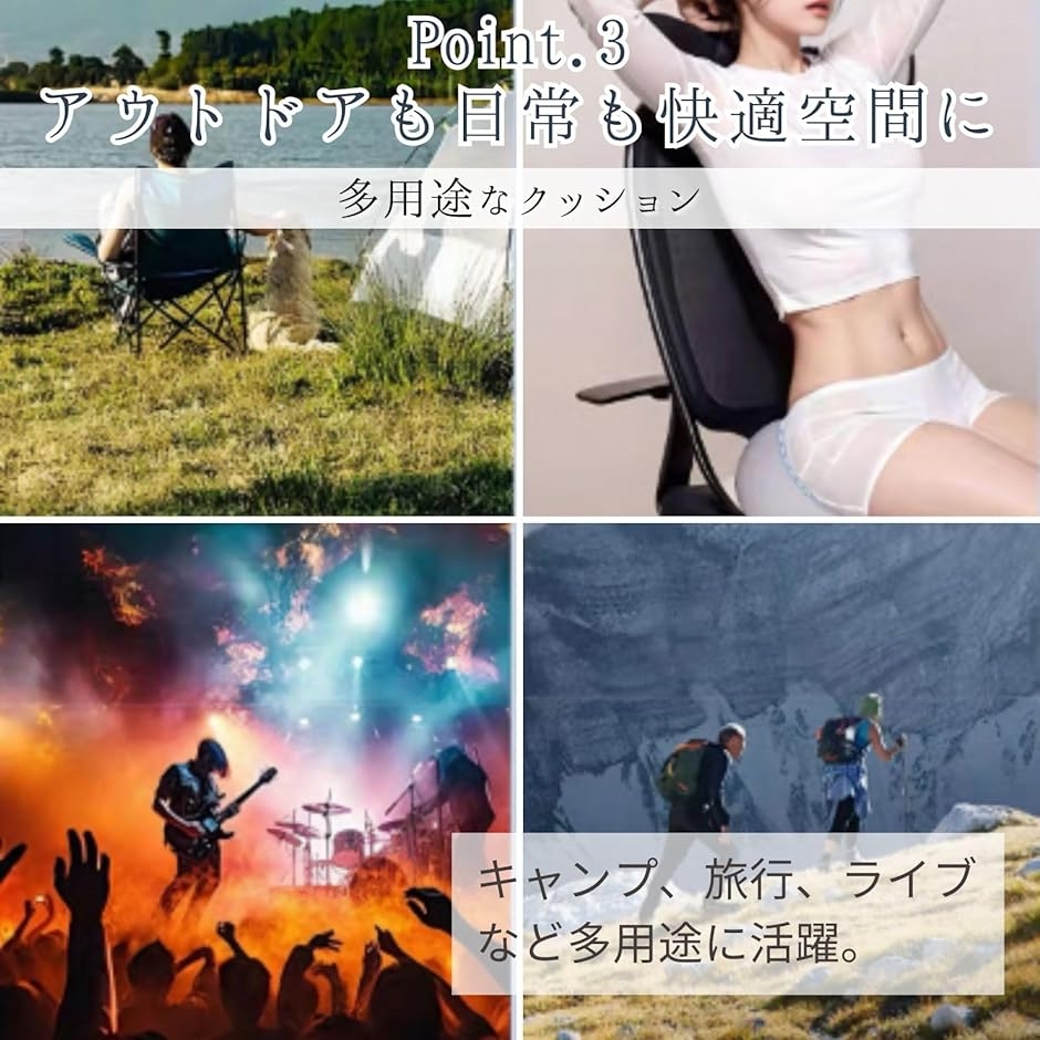 「多用途なクッション」 キャンプや登山、ピクニックなどのアウトドア活動はもちろん、スポーツ観戦やコンサート、飛行機や新幹線での長時間の移動、オフィスでの座布団としても活躍します。