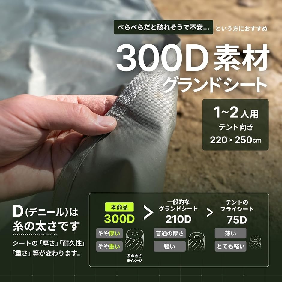 一般的なグランドシートは210D素材が多いですが、もう少し厚みが欲しい。