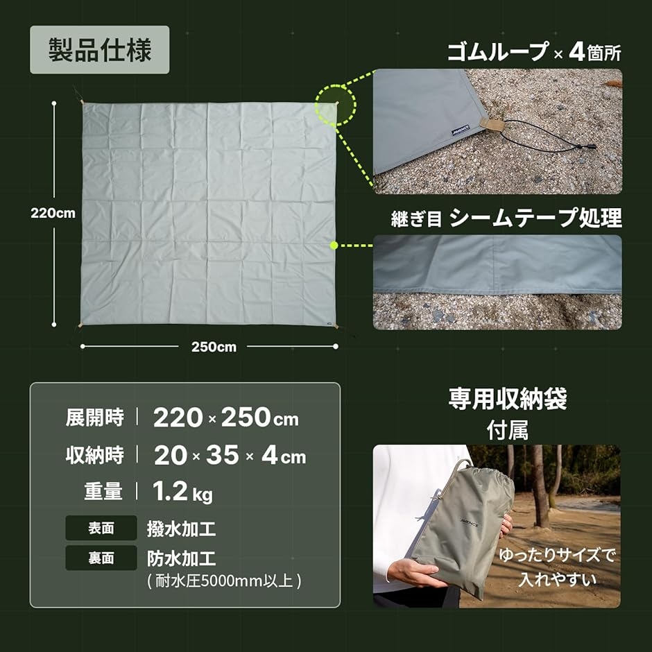 「素材・防水性能」*裏面:耐水圧5000mm以上のPUコーティングを施していますのでキャンプ一晩使用可能です。