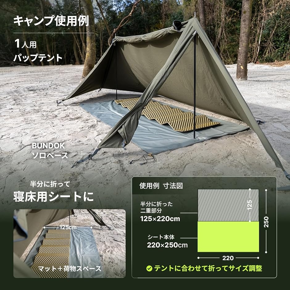「サイズ」展開時:220cmx250cm(収納時:35x20x4cm 重量1.2kg)ソロキャンプ、デュオキャンプで使用するテントはこれ1枚でほとんど対応できます。