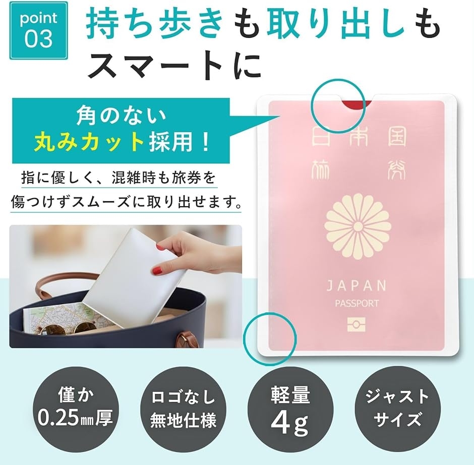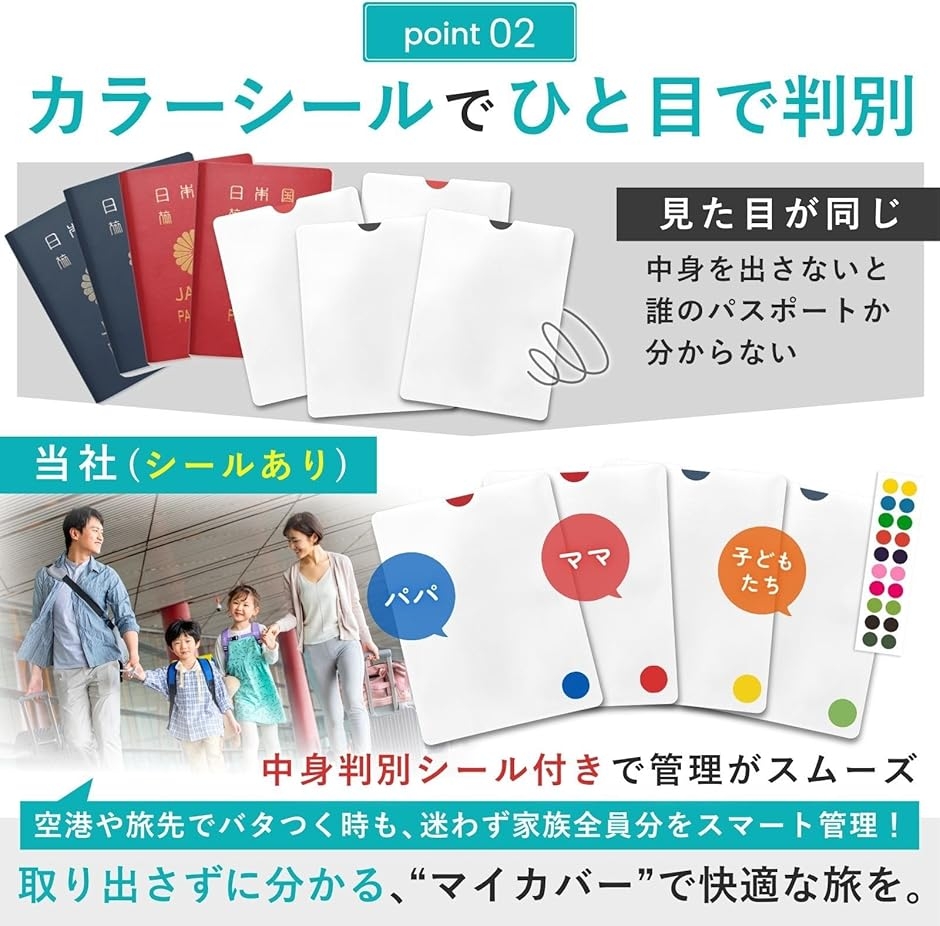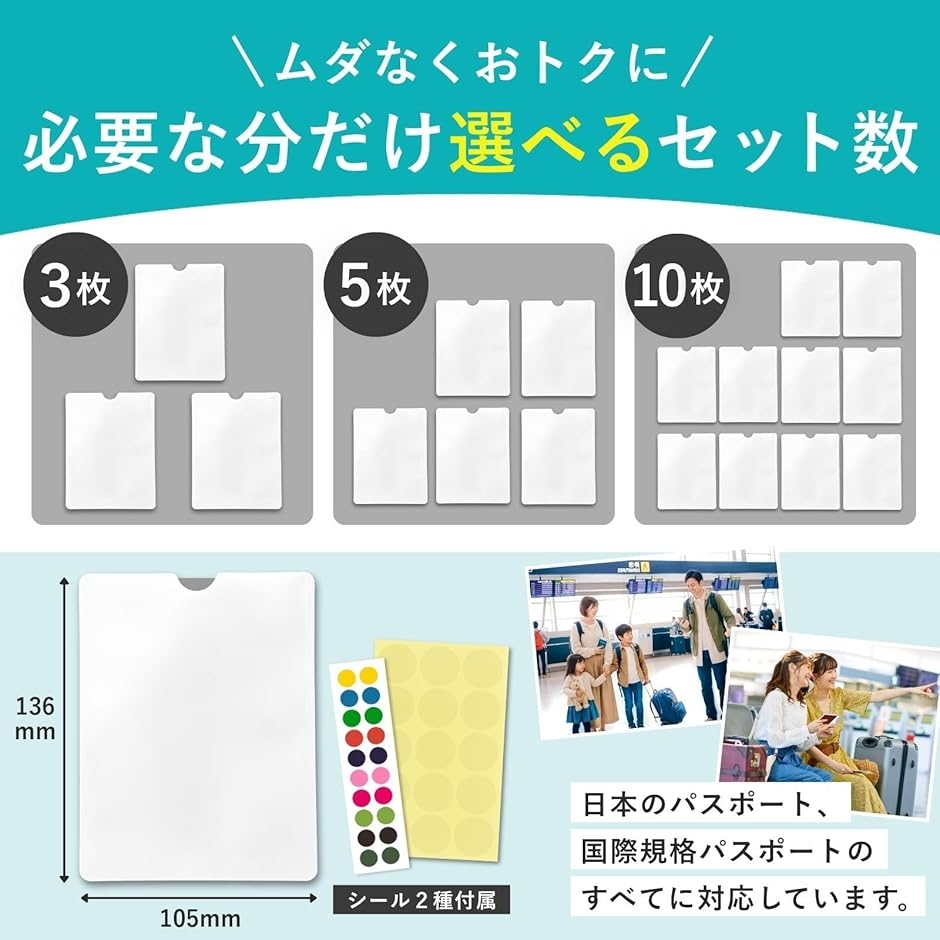「セット内容と商品仕様」 *セット:3枚+判別シール付 *サイズ:約13.6x10.5cm *重量:約4.5g *家族全員のパスポートをまとめて防犯・整理したい方に最適です。