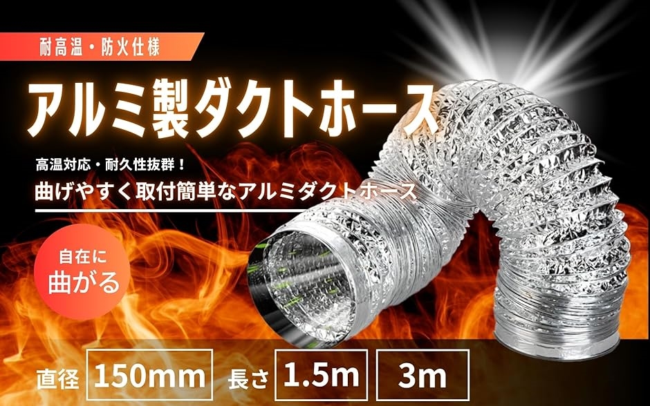 「商品名」ダクトホース 「セット内容」本体x1、取付用アルミテープx1 「サイズ」直径150mm/長さ1.5m または 3m 「素材」二重アルミ箔、強化スチールワイヤー 「カラー」シルバー 「用途」レンジフード、換気扇、ガス乾燥機、エアコン排気、温室換気、工業用排気 など