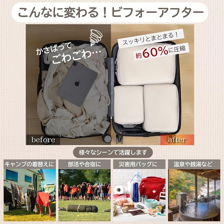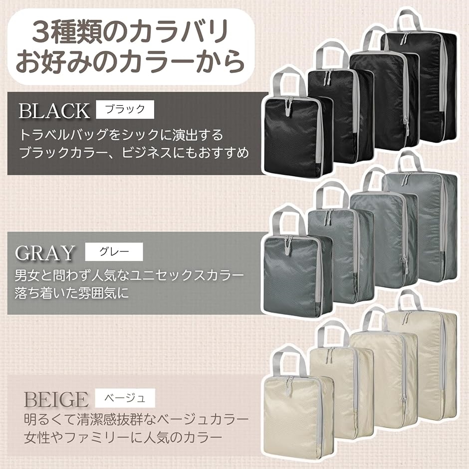 旅行や出張の荷造りをもっとスマートに。「ElevenHeart 旅行用圧縮袋 4点セット」は、かさばる衣類をファスナーを閉めるだけで簡単圧縮。