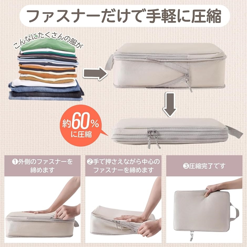 ファスナーを閉めるだけで約60%も衣類を圧縮できます。