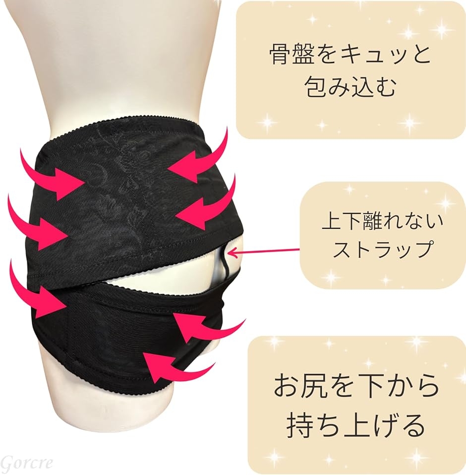 「心地良い締め付けで骨盤補正」と「下から持ち上げ設計でヒップアップ」美スタイルのサポート。腰回りお尻全体を優しくキュッと包み込む。